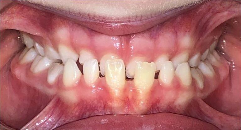 Sometimes, the adult tooth that’s supposed to push out the baby tooth just hasn’t formed yet or isn’t ready to come in. Occasionally, this delay is due to genetics, and some kids may experience late tooth eruptions. I’ve had cases where kids haven’t had their adult front teeth come in until they’re 10! (Like Luciano’s case below!)