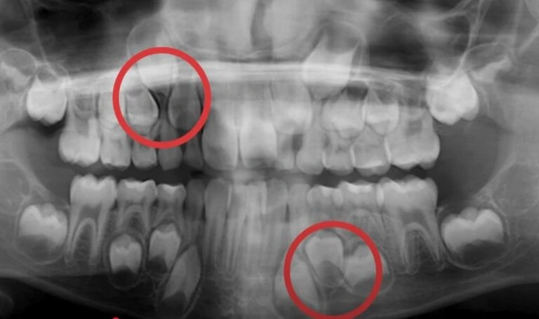 In some cases, the roots of the baby teeth don’t dissolve as they should, keeping them firmly in place. If the permanent tooth beneath isn’t growing in straight, it won’t apply enough pressure to push the baby tooth out. We often see this in kids with crooked or crowded teeth. A quick X-ray can tell us if this is the issue. See the case of Barret, a pediatric patient of mire below!